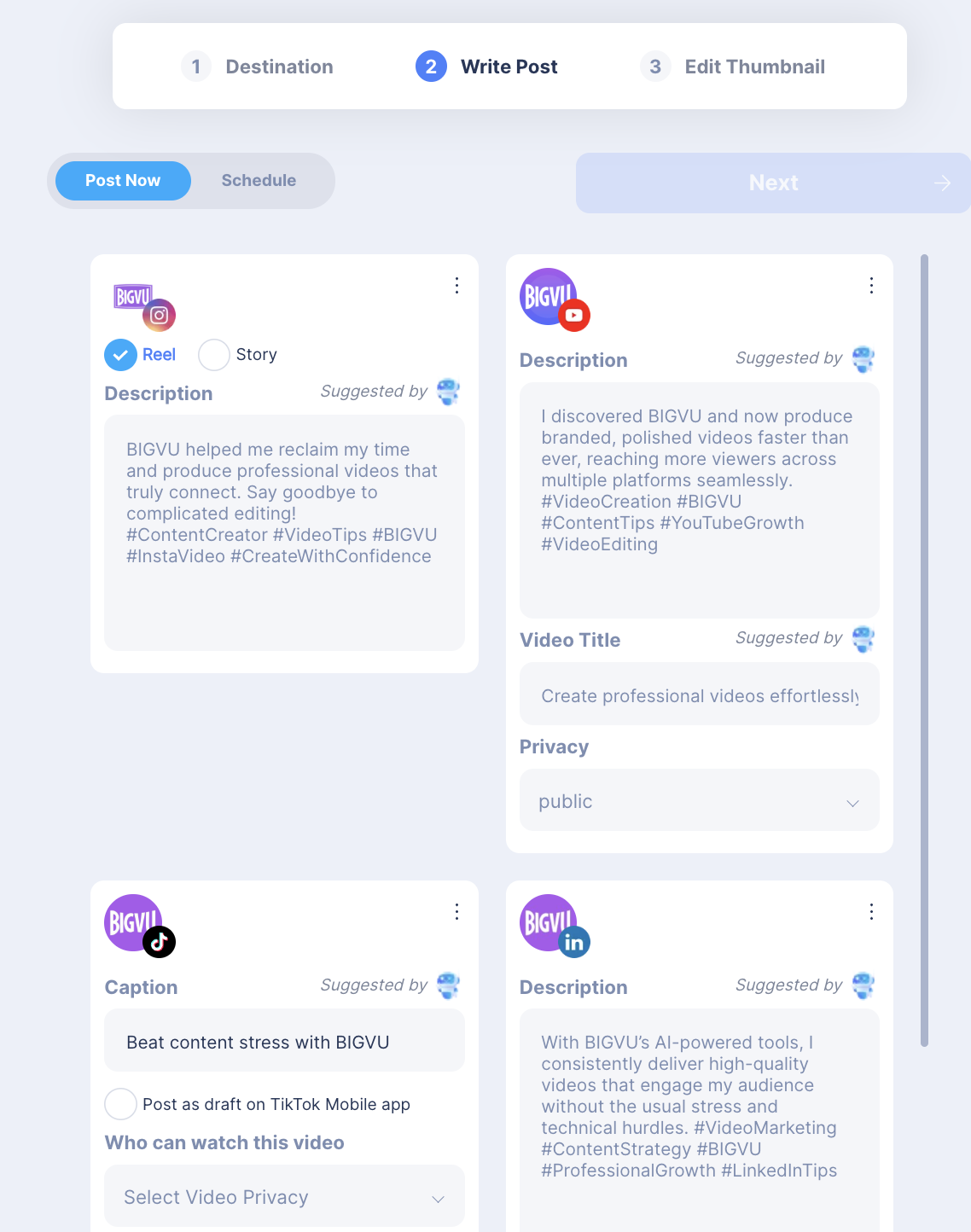 - Now, things get cool! If you have a video script, BIGVU AI will generate captions for your posts on every platform, complete with #hashtags and emojis. And if you don't have a script, no worries! You can let our AI scriptwriter do the magic for you.