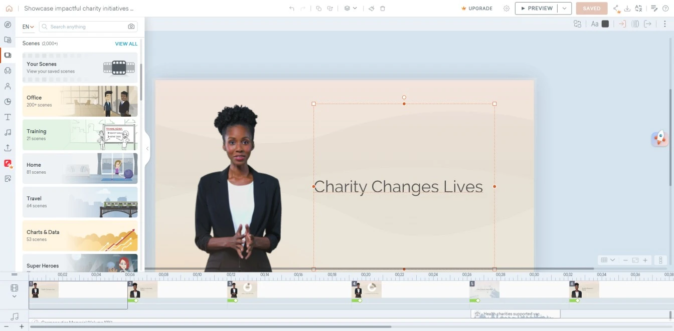 Once the video is generated, you can edit it directly in the timeline. Add or adjust scenes, props, Vyond characters, backgrounds, animations, and more to match your message.